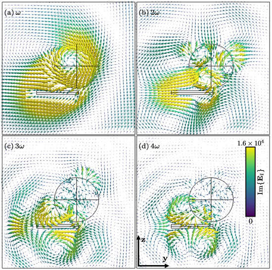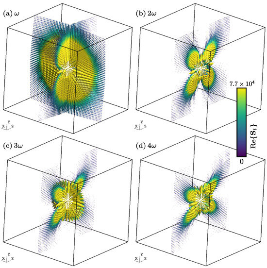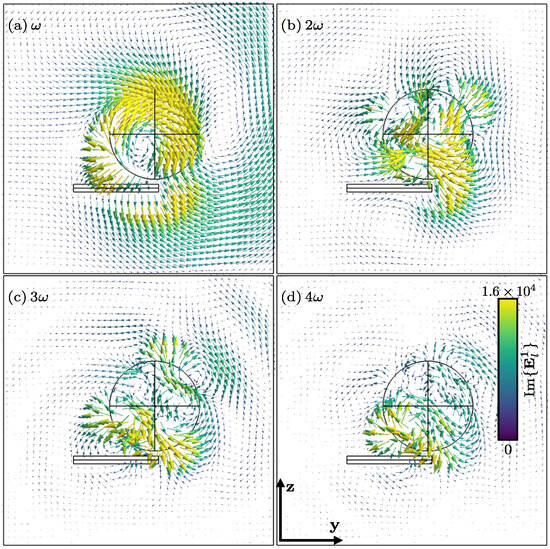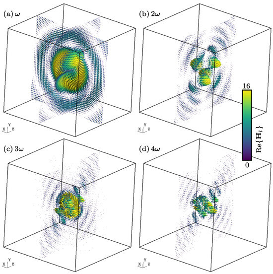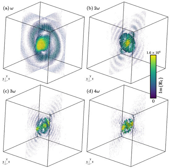 The main consequence of the term-by-term harmonic decomposition of the sources and the conservation of charge is that the electric and magnetic induction fields, respectively and , can be seen as a superposition of the fields and , that is, fields generated by the harmonic densities of the charge and current . Each one of these fields oscillates in terms of multiples of the fundamental angular frequency . This subsection is devoted to this issue, starting work with Equations (19), (20) and (28)–(30) and considering , , and the retarded time.