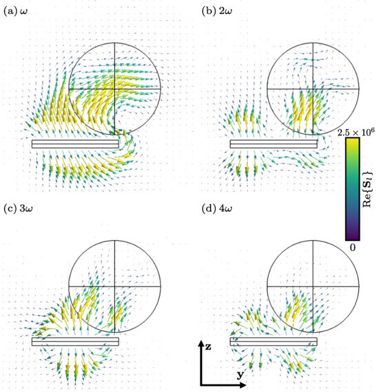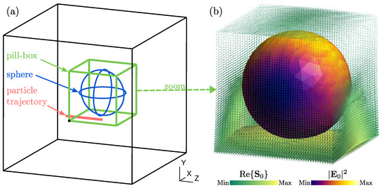 First, we consider the system of Equations (1)–(4) (in the sequelae, the superscript 0 denoting the incident field radiated by the oscillating particle in free space has been removed to alleviate notations). By considering the Lorentz gauge, we can obtain the electric and magnetic fields (, ) using the expressions