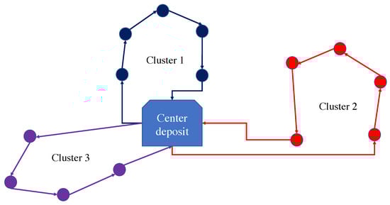 In the field of mathematical modeling similar to the one developed here, there are important contributions in this regard; for example, in [41], a methodology is proposed for the rapid loading of products in an electric vehicle assisted by a service vehicle (drone). In [42], the authors address the stochastic dynamic vehicle routing (SDVR) problem inherent to urban logistics and from a theoretical perspective, and ref. [43] addresses the problem of the minimum spanning tree, a fundamental tool in the analysis and construction of clusters in logistics engineering.