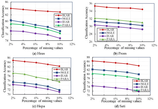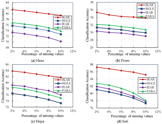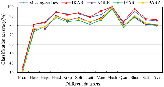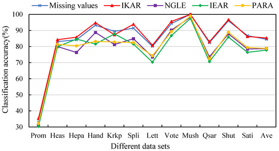 From the results shown in Figure 5 and Figure 6, we can obtain three conclusions as follows: (1) The classification accuracies obtained by the above four attribute algorithms are closer to those of the raw dataset, which indicates that all four algorithms are able to effectively reduce the incomplete dataset. (2) The algorithm has better overall performance. The main reason is that the IKAR algorithm considers both the correlation between attributes and the influence of attributes on the classification two factors, so it obtains a more ideal classification accuracy. (3) The classification accuracy of the IKAR algorithm is higher than the original dataset, and the main reason for this is that the IKAR algorithm effectively eliminates redundant attributes and reduces the influence of noisy data on classification.