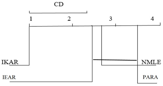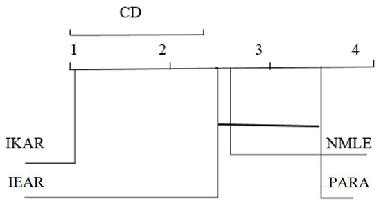 For the same reason, under the RF classifier, the average ranking values of the classification accuracy of the above four algorithms are 1.00, 2.83, 3.67, and 2.50 as shown in Table 6. Since = 26.8 and = 32.043, then . We can see that the classification accuracy of these four algorithms is significantly different in the statistical sense under the RF classifier. From Figure 8, we can ascertain that the IKAR algorithm is significantly different from the NGLE classification, while the ranking of the NGLE, LEAR, and PARA algorithms have no obvious differences among each other.