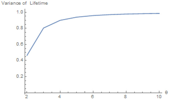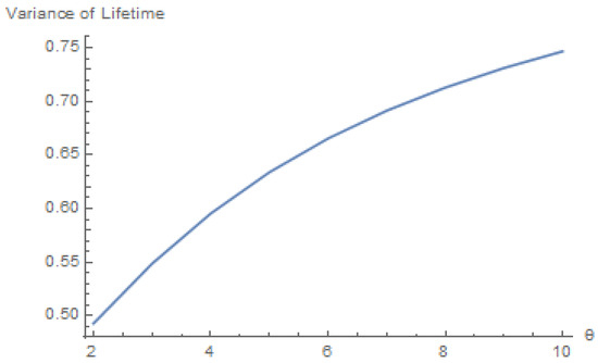 Figure 1, Figure 2, Figure 3 and Figure 4 provide some illustration for the behavior of the expected lifetime and the corresponding variance under the Frank copula-based dependency. More precisely, the mean lifetimes (along with their estimated variances) of systems RS2 and RS3 are depicted in Figure 1, Figure 2, Figure 3 and Figure 4 for different values of the design parameter .