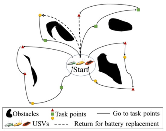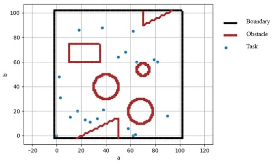 Figure 1 shows an example with three USVs and 13 tasks, where different tasks are assigned to three vessels of different types. Due to their limited battery capacity, USVs may have to return to the starting point to change a battery and replenish energy during the tasks. In this study, the task points are presented by a two-dimensional plane space with a length and width of 100 units. As shown in Figure 2, the modeling of the environment consists of three parts: boundaries, obstacles, and task points. All task points and obstacles are distributed within the boundaries.