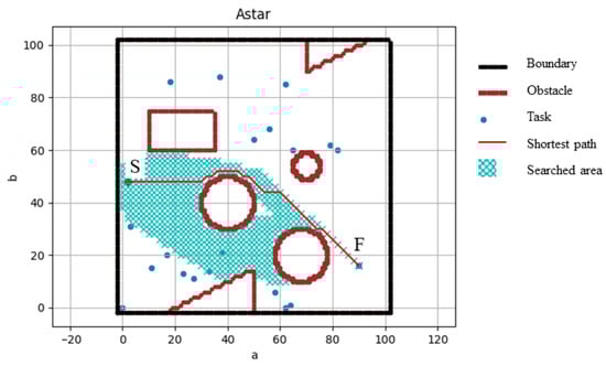 An example of the A* algorithm for path searching is shown in Figure 4. The length of the shortest path found by the A* algorithm is used to calculate the travel time between task points S and F.