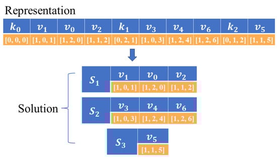 An example for a solution is shown in Figure 5. In this solution, three ships perform seven tasks. For example, element represents a USV with serial number 1 of type 2. Similarly, represents a task of type 2 with serial number 0. The solution can be represented as , and the sequence of tasks for each vessel can be represented as , , .