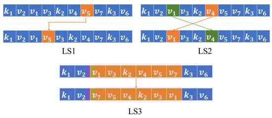 Three LS operators, named as LS1, LS2, and LS3 in the first type, are designed to adjust the task allocation and completion order in the same type of USVs to find better neighbor solutions. As shown in Figure 7, LS1 is used to randomly select an element and insert it into another random position. LS2 selects two elements randomly and exchanges their positions. By LS3, a segment of a solution is randomly selected and the order of elements in it is reversed.