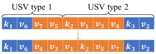 A USV scheduling problem is to assign tasks to USVs and sort the assigned tasks for each USV. According to the characteristics of the problems, we design an encoding strategy to represent a solution. It is in the form of . A USV with serial number is assigned to the sequence of tasks , where or is a vector with three elements denoted as to present the attributes of USVs or tasks. If has a value of 0, it represents a USV, while if it has a value of 1, it represents a task; gives the type of the USV or task; and indicates its index.