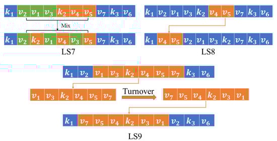 The LS operators in the second type consider the heterogeneity of the USVs. LS4 selects an element randomly and inserts it into the sequence of a heterogeneous USV that is also randomly selected. LS5 exchanges the positions of two randomly selected elements from the sequences of two heterogeneous USVs. By LS6, a segment of a solution is randomly selected where the tasks belong to heterogeneous USVs. Reverse operation is executed on these elements and the assigned USV of each task may be changed. The detail for LS6 is shown in Figure 8.