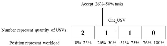 By QL2, the states in the Q-table are set to be the loads of USVs in the ship cluster. Similar to QL1, QL2 uses four numbers to represent a state. As shown in Figure 11, each value represents the number of USVs and its position denotes the USVs’ workload. The workloads are described as 0–25%, 26–50%, 51–75%, and 76–100%, respectively. In a state S = [2,1,1,0], each value means the number of USVs under the corresponding task load.