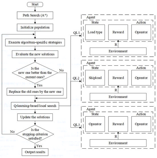 This study proposes three Q-learning strategies to guide local search selection, which are embedded into three meta-heuristics: GA, SA, and HS. The framework of the proposed algorithms is shown in Figure 12. First, the population is initialized by the solutions generated in Section 4.2, and then the initial solutions are evaluated. Second, new solutions are generated by the algorithm-specific strategies. Then, the QL-based local search strategies in Section 4.6 further optimize the solutions by meta-heuristics. Finally, it repeats the whole iteration process until the termination condition is reached, and then outputs the best results.