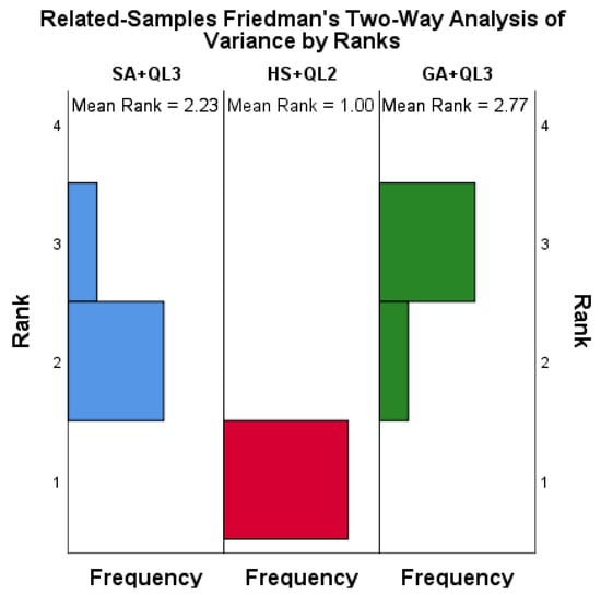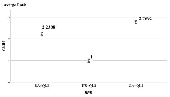 These algorithms were ranked using the Nemenyi post hoc test, and the resulting rankings are shown in Figure A2, Figure A3 and Figure A4. In the three groups, the three algorithms, SA + QL3, GA + QL3, and HS + QL2 have the smallest average ranking values (1.08, 2.15, and 1.77), respectively. Friedmann’s two-way analysis of variance by rank gives a clearer presentation of the instance distribution for the compared algorithms, as shown in Figure A5, Figure A6 and Figure A7. It can be seen that SA + QL3, GA + QL3, and HS + QL2 achieve the best results in most cases.