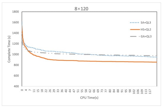 To present the convergence of the three algorithms clearly, Figure 16 shows the convergence curves of them for the largest instance, “8 × 120”. The convergence curves of another case are shown in Figure A8, Figure A9, Figure A10 and Figure A11 in Appendix B. It can be seen from the figure that the convergence of HS + QL2 performs the best among the three algorithms, and its final result is also better than those of its peers.
