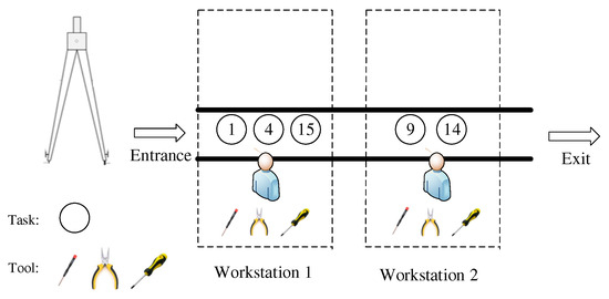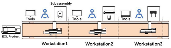 Over the years, a large quantity of EOL products have been accumulating. There are many useful parts in these products, and recycling and reusing them is an important part of the development of the circular economy. Disassembly is an important means to product recycling [1,2,3], and the structure of the disassembly line is shown in Figure 1. However, in the process of disassembly, the wear degree of disassembly tools and the execution order of tasks can lead to different disassembly times for tasks on the workstations, which affects the efficiency of disassembly. Considering these factors, a good disassembly scheme is very important for the recovery of EOL products [4,5,6,7]. In order to solve this problem, many researchers have studied the disassembly line balancing problem (DLBP).