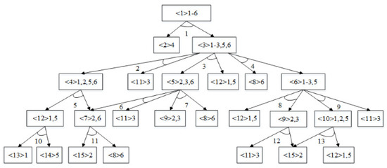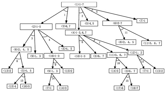 As shown in Figure 4, by performing disassembly task 1, subassembly <1> can be disassembled into subassembly <2> and subassembly <3>; then, subassembly <1> is called the parent node of subassembly <2> and subassembly <3>, and subassembly <2> and subassembly <3> are called the child node of subassembly <1>. Subassembly <2> and <3> form an AND relationship. Subassembly <2> can choose to perform disassembly task 3 to obtain subassembly <8> and subassembly <9>, and subassembly <2> can also choose to perform disassembly task 4 to obtain subassembly <5> and subassembly <10>. Disassembly task 3 and disassembly task 4 form an OR relationship, so we can only select one of them to put into the disassembly sequence.