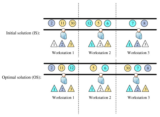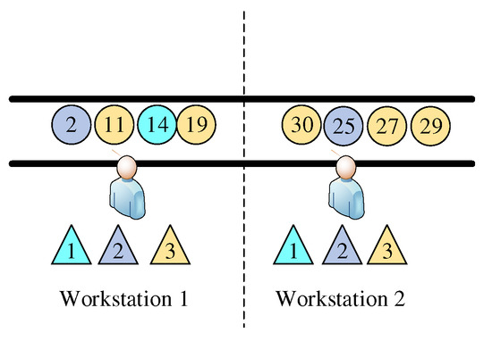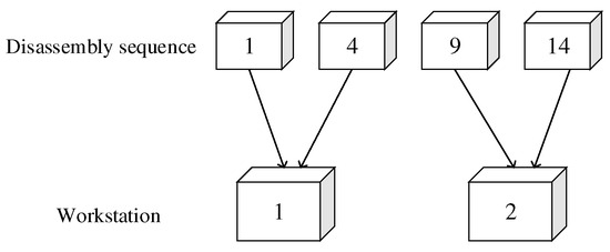 In the decoding process, each task in the sequence of feasible tasks is assigned to the workstation in turn and satisfies the cycle time constraints of the workstation. When assigning a task, we calculate whether the total disassembly time of all disassembly tasks on the current workstation exceed the workstation’s cycle time after assigning the task to the current workstation. If the total disassembly time exceeds the cycle time of the workstation after assigning the task, the task is assigned to the next workstation. If the total disassembly time does not exceed the workstation’s cycle time after assigning the task, we randomly assign the task to the current or next workstation. The decoding diagram is shown in Figure 6. In summary, the disassembly task sequence can be decoded to obtain a specific solution, after which we can calculate and evaluate the target function value of the solution.