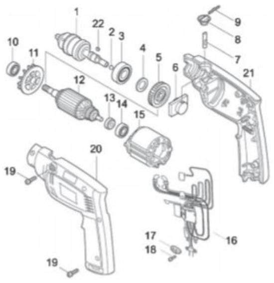 As in other process-oriented system studies, formal modeling of disassembly processes is always desired [34]. In this work, we use the AND/OR graph to describe the disassembly process of EOL products. The AND/OR graph can not only obtain the precedence and conflict relationship of disassembly tasks but also obtain the relationship between disassembly tasks and subassemblies. The necessity of an AND/OR graph in disassembly planning lies in representing the sequential relationships between the operations or tasks involved in the disassembly process. It helps to determine the order of disassembly of subassemblies based on their subordinate relationships and constraints. For a disassembly task sequence, each disassembly task in the sequence needs to meet the constraints specified by the AND/OR graph to ensure that the disassembly sequence is correct and feasible. The nodes in the AND/OR graph represent the subassemblies of the product. In each node, the number in angle brackets represents the index of the subassembly, and the number after angle brackets represents the smallest non-detachable part index contained in the subassembly. The directed angle going out of the node represents the disassembly task. Disassembly tasks starting from the same node have an OR relationship. When different disassembly tasks can be executed under a node, only one disassembly task can be selected for execution. The parent subassembly can obtain multiple sub-components by performing a disassembly task, and these sub-components form an AND relationship. Figure 3 shows a case of compass, and Figure 4 is its AND/OR graph. From these two figures, it can be seen that the compass includes 18 subassemblies and 15 disassembly tasks.