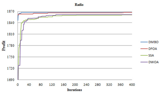 In order to check the performance of DMBO in solving optimization problems, we also use discrete fruit fly optimization algorithm (DFOA) [41], a discrete whale optimization algorithm (DWOA) [42], and a salp swarm algorithm (SSA) [43] to solve the problems in this study. DFOA is easy to understand and implement, with low computational complexity and strong local search capabilities. DWOA is a swarm intelligence optimization algorithm that mimics the behavior of humpback whales during hunting. It has the characteristics of fewer parameters and fast convergence speed. SSA has low complexity, strong flexibility and basically does not require parameter settings, making it have good application prospects in various optimization fields. Under the condition of 400 iterations and 100 population sizes, 20 experiments are carried out, the optimal value of each generation is recorded in each experiment, and then the average value of each generation is calculated. Take the radio as an example. Its iterative process is shown in Figure 19. From the iteration chart, it can be observed that DMBO exhibits strong global search capability. Compared to the other three algorithms, DMBO converges faster and is able to find better solutions in fewer iterations.