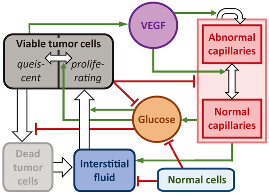 Interstitial fluid enters the tissue from capillaries, two types of which are taken into account: normal, , and abnormal, . Abnormal capillaries possess increased permeability to fluid and glucose due to the influence of vascular endothelial growth factor (VEGF) v. It is produced by nutrient-deprived quiescent cells. It also stimulates the formation of new capillaries in the abnormal state. At low VEGF concentrations, capillaries normalize, which implies a decrease in their permeability. Normalized excessive capillaries tend to return to their basal physiological density, which reflects the process of the pruning of microvasculature in healthy tissues. Interstitial fluid drains into the lymphatic system, which is not considered explicitly but is assumed to have a density proportional to that of normal cells. Consequently, the lymphatic capillaries are absent within the tumor. Blood capillaries degrade within the tumor due to implicit factors, such as rupture caused by their displacement and due to biochemical reasons [36].