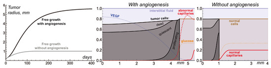 Figure 2 compares the cases of free tumor growth with and without the initiation of angiogenesis under the same values of model parameters, as presented in Table 1. Initially, the tumor consists entirely of proliferating cells, with their number growing exponentially. However, within a few hours, some tumor cells start experiencing a deficiency of nutrients, which are supplied to the tumor mass from surrounding capillaries that are pushed away by the expanding tumor. Consequently, tumor growth slows down, and the tumor obtains a layered structure. Its inner core becomes predominantly occupied by quiescent cells, and the outer rim by proliferating cells. This structure is characteristic of tumor spheroids in experimental settings and non-invasive tumors in vivo. As the total number of tumor cells keeps increasing, the further exacerbation of nutrient deficiency results in the appearance of dead cells in the tumor core. Their degradation turns them into a viscous liquid, which, from a modeling point of view, is indistinguishable from the rest of the interstitial fluid. The decrease in the number of tumor cells in the central part of the tumor implies the stretching of the solid phase of the tumor tissue. This, in accordance with the biomechanical terms in Equation (1), underlies the elevated fluid pressure in the tumor core compared to the surrounding normal tissue. Therefore, fluid oozes from the tumor mass, contributing to a further decrease in its growth rate. When the total rates of tumor cell proliferation and death equate, the tumor reaches a stable state.