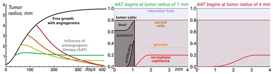 Figure 3 illustrates the nontrivial nature of tumor response to AAT under the variation in tumor radius at which the treatments begin. The elimination of VEGF for the 1 mm tumor yields its quick growth saturation. The capillary system that undergoes degradation within the tumor volume, normalization, and pruning is eventually stabilized with a slightly greater total amount of capillaries than in the case of the avascular tumor. Therefore, it can support the existence of a stable tumor slightly greater than 1 mm in radius.
