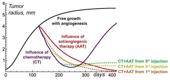 A delay to the beginning of AAT within its combination with CT ensures the faster initial shrinkage of the tumor. The seeming benefit of such an approach, nevertheless, is deceptive. At the moment of the third and fifth injections of the chemotherapeutic drug, the tumors have radii of ≈1.9 mm and ≈0.7 mm, respectively. In accordance with the simulations presented in the previous section, the AAT initiated for such tumors results in their stabilization at small but notable sizes. Thus, the delay in AAT administration in combination with CT compromises the potential curative effect of the treatment.