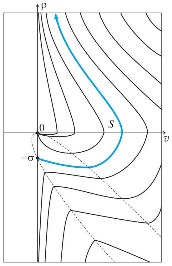 The most interesting picture is at , when the zero front asymptotically approaches the point , at which Equation (5) has a singularity.