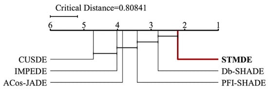 We deploy the Friedman test [25] to verify the performance of the STMDE in this subsection, which is shown in Figure 1. It can be observed that the proposed STMDE performs best among all compared algorithms with the smallest performance ranking, namely 2.21. To show the statistical significance more clearly, we also present the critical difference diagram [26]. The critical difference diagram as shown in Figure 2 discloses that the STMDE is the most powerful optimization algorithm among all compared DE variants.