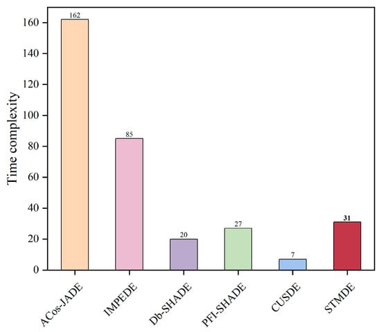 T0 and T1 are 0.01 s and 0.87 s, respectively. From Figure 3, we can observe that ACos-JADE is the most time-consuming while CUSDE requires the least running time. The time complexity of the proposed STMDE is 31, which is second to IMPEDE with 85. The optimization time of Db-SHADE and PFI-SHADE are 20 and 27, respectively.
