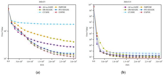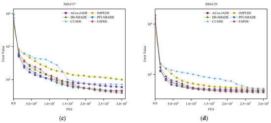 Convergence graphics of STMDE and compared DE variants; (a) convergence graphic on 30-D F5; (b) convergence graphic on 30-D F15; (c) convergence graphic on 30-D F17; (d) convergence graphic on 30-D F29.
