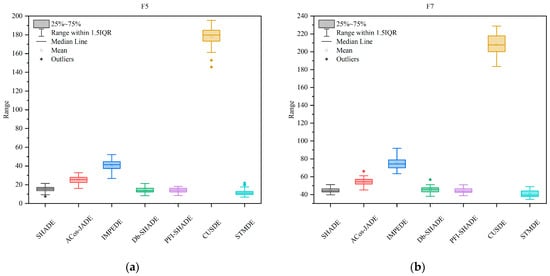 The convergence graphics of the STMDE and five SOTA DEs in 30-D test functions are given in Figure 4, which includes simple multi-modal function (F5), hybrid functions (F15 and F17) and composition function (F29). On the whole, the STMDE can obtain smaller error values than compared DE variants. On the 30-D F5, the STMDE shows advantage over others when the FES is larger than 1 × 105 while ACos-JADE, Db-SHADE and PFI-SHADE can achieve better performance in the early evolutionary stage. On the 30-D F15, the STMDE achieves similar performance to Db-SHADE while PFI-SHADE, CUSDE and PaDE outperform the STMDE in the preliminary stage. Along with evolution, the STMDE converges more effectively. On the 30-D F17, the STMDE ranks fourthly when the FES is less than 1.5 × 105, while it achieves a better converged population than any DE variant when the FES increases to 2.5 × 105. On the 30-D F29, the STMDE shows competitiveness when the FES is more abundant. To be specific, the STMDE achieves the smallest error value when the FES is larger than 1.5 × 105.