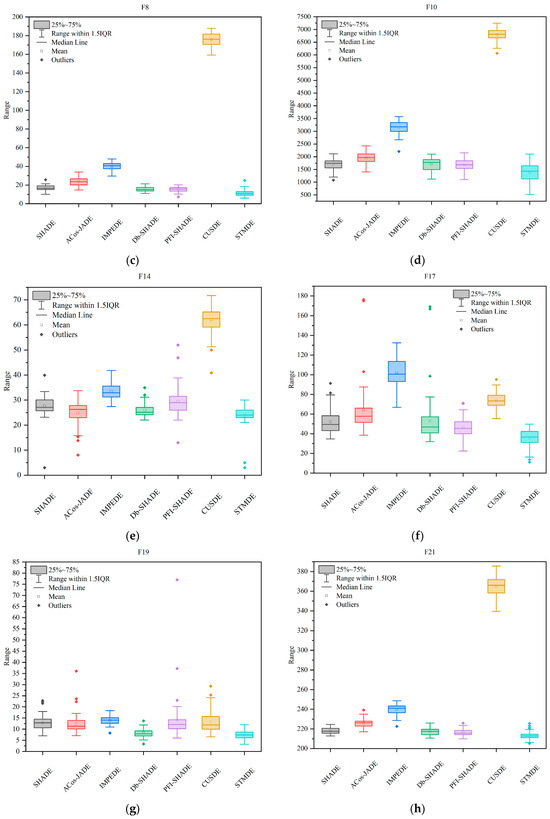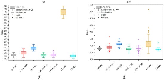 Box plots of error for STMDE and compared DE variants (a) on 30-D F5; (b) on 30-D F7; (c) on 30-D F8; (d) on 30-D F10; (e) on 30-D F14; (f) on 30-D F17; (g) on 30-D F19; (h) on 30-D F21; (i) on 30-D F23; (j) on 30-D F29.