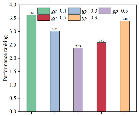 In this subsection, the parameter sensitivity is analyzed, including DCcr (as shown in Figure 6), DCf (as shown in Figure 7), T (as shown in Figure 8) and gp (as shown in Figure 9). 30-D benchmark functions from the CEC2017 test suite are utilized to investigate the parameter sensitivity. In addition, the Friedman test is implemented to figure out the performance rankings for different settings of parameters.