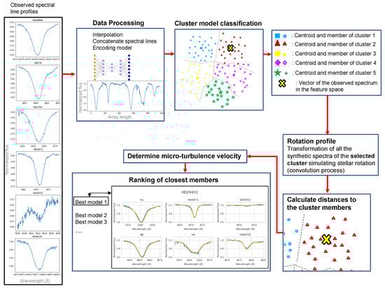 The proposed methodology consists of a strategy focused on training clustering models on the synthetic spectra reduced to only six line profiles. This produces an advantage in the search process since, by classifying a real spectrum in one of the clusters defined by the model, the number of synthetic spectra with which it must be compared is reduced. The developed method has a data preprocessing step (see Section 3.1.1). This includes coding spectral models using an autoencoder to facilitate cluster modelling (see Section 3.1.2). After the classification of the observed spectra (see Section 3.1.3), it is necessary to apply stellar rotation transformations on all the synthetic spectra of the selected cluster, through a convolution process (see Section 3.1.4), according to the velocity parameters of the analysed star. This last process helps to generate a detailed comparison of each of the spectral lines, since in this way, all the spectra are affected by the same line broadening due to stellar rotation. Thus, the comparison mechanism of the real spectrum vs. the individuals in the cluster is determined by the KNN algorithm (see Section 3.1.5). Finally, when the search algorithm is fully processed, the result is a ranking of spectral models that best fit the real spectrum according to a distance metric (see Section 3.1.7), in addition to the comparative plots of the best model with the observed spectrum (see scheme in Figure 2).