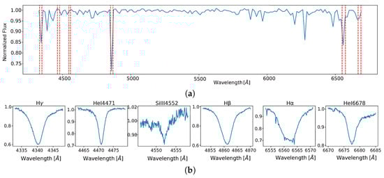 The wealth of information that grid models possess is fundamental to spectral analysis. However, not all of it has the same value if we focus on an efficient search strategy. For this reason, we propose to select only six spectral lines from each of the models, which have been used in different studies of massive stars [,,] because of their direct relationship with the main parameters of this type of object. These are (in ascending order according to their wavelength) as follows: H, He I (), Si III (), H, H, He I () (see Table 2 and Figure 3). It is common to observe in massive stars high-intensity Balmer lines, which are a useful source of information to determine stellar gravity and parameters related to stellar winds. The He I and Si III lines allow us to determine the effective temperature and abundance of these elements. Thus, the complexity of the spectral models is reduced to their representation of only six line profiles, which for analysis purposes are concatenated considering a specific wavelength range for each of them (see Table 2). Each spectral model is a vector of length 966 since per line profile, 161 points are considered, where these are represented in a 966-dimensional feature space. In addition, it is necessary to interpolate the lines so that their points are equidistant.
