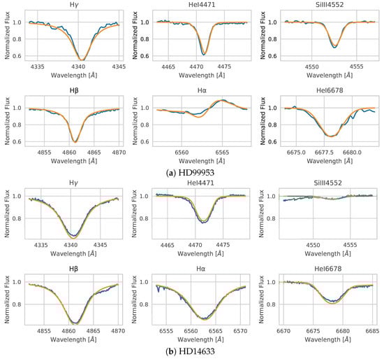 This image shows two results of the algorithm as an example, for stars HD99953 (a) and HD14633 (b): Comparative plots of six spectral lines between the observed spectrum (blue curve) and the synthetic spectrum (orange curve).