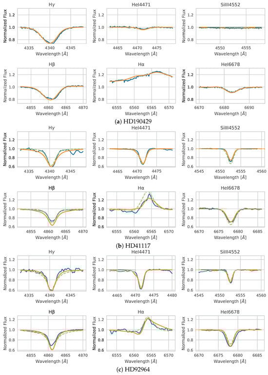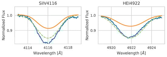 Analogously, other spectral lines available in the models were selected to evaluate the six spectra with unexpected parameters. In the case of the star HD30614, the spectral models obtained in [] and in this work were compared. In Figure 8, some additional spectral lines are shown (differently from those mentioned in Table 2). The lines of SiIV4116 and HeI4922 were compared between those belonging to the model selected by the algorithm, those of the expected model, and the lines of the observed spectrum. In general, we can see a better fit of the spectral lines by the spectral model obtained in [] concerning the observed spectrum.