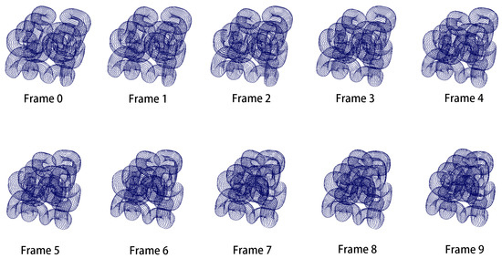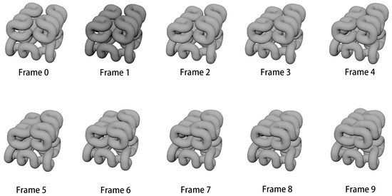 In this paper, we use XPBD to simulate the shape deformation of selected 3D models for over 200 frames on an Intel i7 9700 CPU with a clock rate of 4.7 GHz for experiments of the proposed approach in the following Section 4. Figure 2 shows the simulation outcomes of a cube-rope model from frame 0 to frame 9. The package of XPBD simulation “PositionBasedDynamics”, provided by Bender et al., is open-sourced and available in [48].