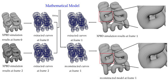 In order to use the proposed algorithm to reconstruct the deformed shapes, we convert the surface-represented 3D model shown in Figure 3 into a curve-represented model. We manually extract curves along the length direction of the cube-rope model. The cube-rope model is defined by 19,968 vertices. In total, 24 curves are extracted, and each curve has 832 points. Figure 4 shows the curve-represented models at the 10 frames: . Each extracted curve is then used to fit the proposed mathematical model and recreated by the method presented in Section 4. Finally, all the curves are used to reconstruct the cube-rope models. The whole framework is shown in Figure 5 for a better understanding.