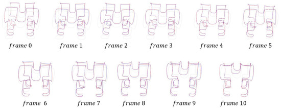For the static reconstruction with B-Spline curves and linear interpolation called static B-Spline curve-based linear interpolation, we use cubic B-Spline curves with 50 control points each provided in [53] to fit the model and obtain B-Spline curves at frames 0, 2, 4, 6, 8, and 10. Then, we linearly interpolate two adjacent B-Spline curves at frames 0, 2, 4, 6, 8, and 10 to obtain the B-Spline curves at frames 1, 3, 5, 7, and 9, and depict B-Spline curves at frame as light green curves in Figure 6 as well.