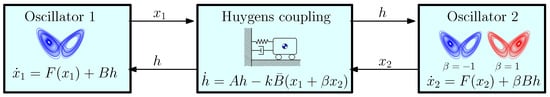 The basic idea in this work is to apply Huygens’ coupling in the context of chaotic oscillators. Roughly speaking, we want to replace the pendulums in the schematic diagram of Figure 1b by chaotic oscillators, as shown in the block diagram of Figure 2, and to determine the possible synchronous behaviors.