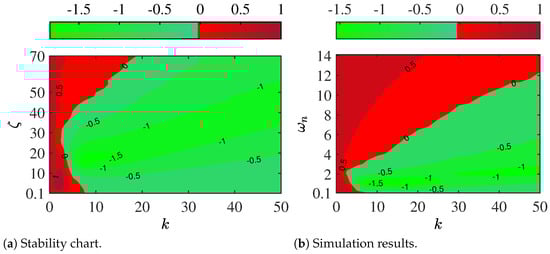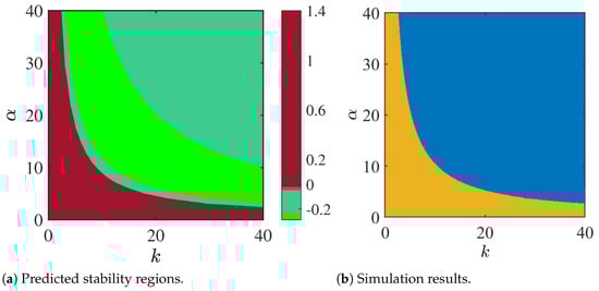The panel on the left is the stability chart, which shows the value of computed either from Equations (16)–(33) or from Equations (28)–(33). Green: and, thus, the corresponding synchronous solution is stable. Red: and, consequently, the synchronous solution is unstable. In the lemon green area, is more negative and, thus, it would be convenient to choose values of k and within this region. On the other hand, the panel on the left shows the simulation results obtained by numerical integration of Equations (30)–(32) for either (mixed synchronization) or = −1 (complete synchronization). Blue: complete synchronization if = −1 or mixed synchronization if . Orange: unstable behavior. Note that the red region in the left panel should be associated with the orange region in the right panel. Likewise, the green areas in the left panel should be compared to the blue in the right panel. As can be seen, there is a clear agreement between the predicted stability regions (left) and the obtained numerical results (right).