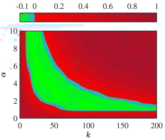 The next step is to compute the largest transverse Lyapunov exponent either from Equations (16)–(33) or from Equations (28)–(33). In this case it does not matter which equation we use for the stability analysis, since for this particular case both equations are identical, as mentioned above. For the computation of , we use the Wolf algorithm [] and the following parameter values: , which are the standard values for the Lorenz system, and, for the dynamic coupling, we take and . With this, the largest transverse Lyapunov exponent is computed as a function of the coupling strength k and parameter , both are varied in the interval in steps of 0.5. The obtained results are shown in Figure 3a, where the green colors indicates the areas where is negative and, therefore, in that region of the ()-plane, the complete synchronous solution is locally stable for , whereas the mixed synchronization solution is locally stable for . Different green tones are used to indicate how negative is. On the other hand, in the red region, is positive and, thus, for that combination of values of the synchronous solution, either complete synchronization or mixed synchronization, is unstable.