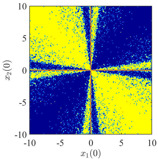 Limit behavior of a pair of chaotic Lorenz systems, with the coupling vectors given in (34), as a function of the initial conditions and . Yellow: mixed synchronization. Blue: complete synchronization. Red: convergence to an unsynchronized equilibrium.