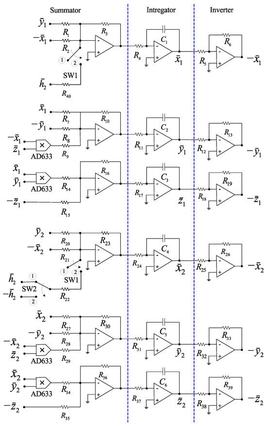 This is the system of equations that we use for electronic implementation using analog circuits, including resistors, capacitors, multipliers, and operational amplifiers. The specific parameter values of these components are presented in Table 1.