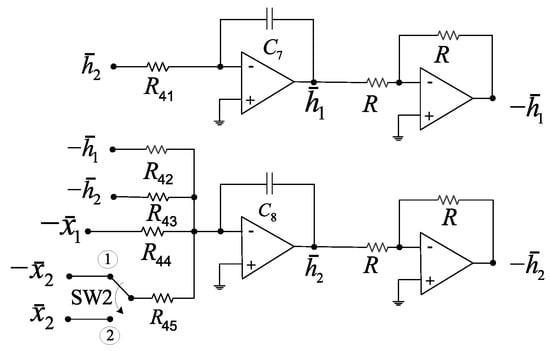 On the other hand, switch 2 (SW2) is, indeed, the parameter . For , i.e., mixed synchronization, switch SW2 in the diagram of Figure 7 should be in position 1, whereas switch SW2 in Figure 8 should be in position 2. On the other hand, for , i.e., for complete synchronization, the positions of the switches SW2 mentioned before have to be reversed.