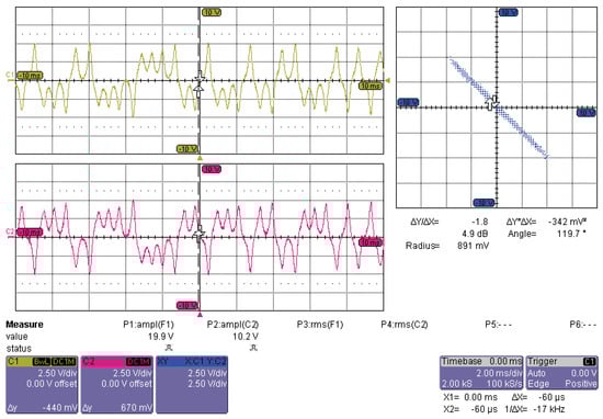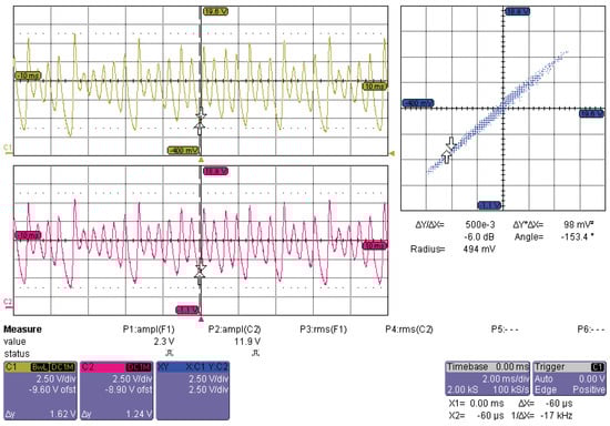 The obtained experimental results, for the case of mixed synchronization, are shown in Figure 9, Figure 10 and Figure 11. The time series were recorded using a Teledyne Lecroy oscilloscope. As can be seen, besides the unavoidable (small) differences in the components of the circuit, the variables (voltages) and are in anti-phase (see Figure 9), and the variables and are also in anti-phase (as shown in Figure 10), whereas the and variables are in complete synchrony (see Figure 11). Thus, the circuit exhibits the desired mixed synchronization behavior according to Definition 2 (see Equation (11)).
