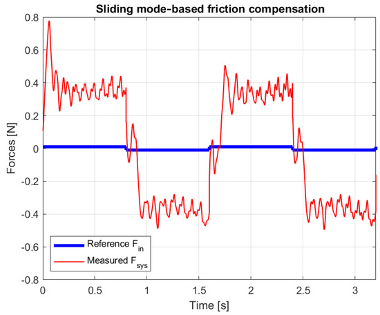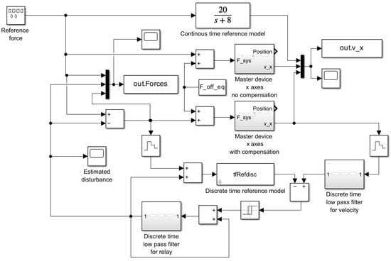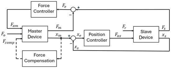 The role of the force controller (see Figure 3) is to balance the total forces  and , for which traditional PID controllers are commonly used. In certain applications, such as micromanipulation control tasks, a PID controller may not be able to properly compensate for the force difference, and it is necessary to add another type of force compensation. The goal of the compensation is to create a mode of operation where the operator can mainly feel the reaction force  (feedback) and comfortably move the master device (joystick) when controlling the remote device.