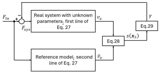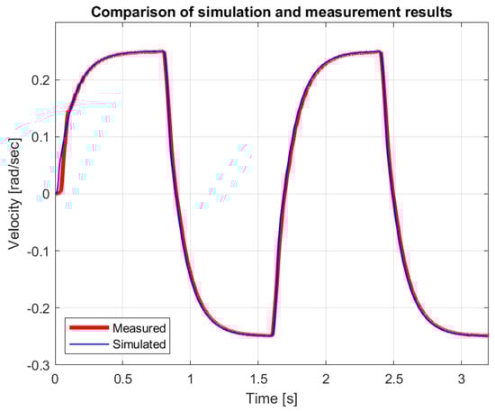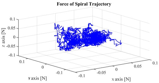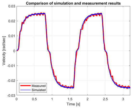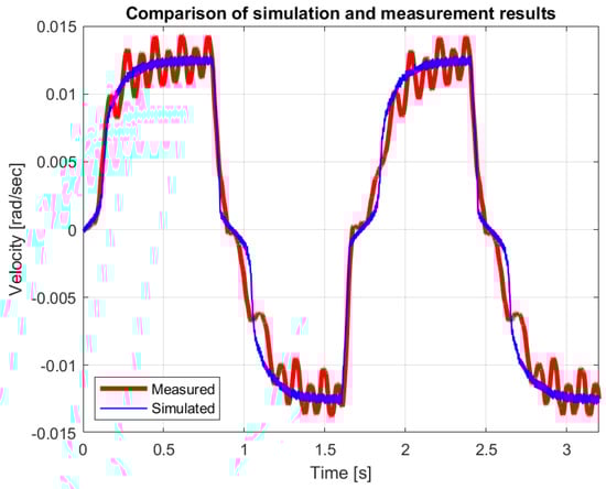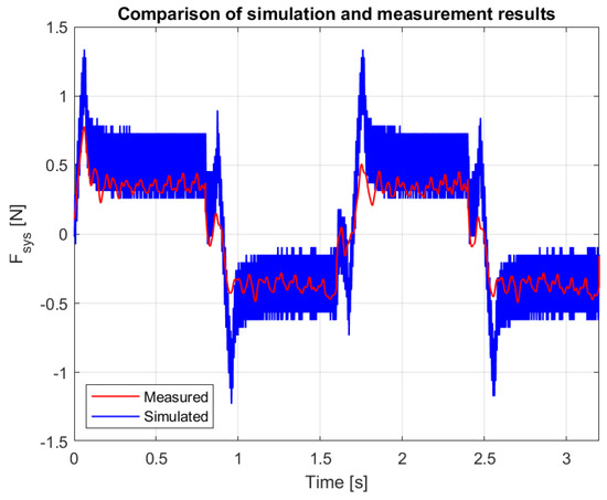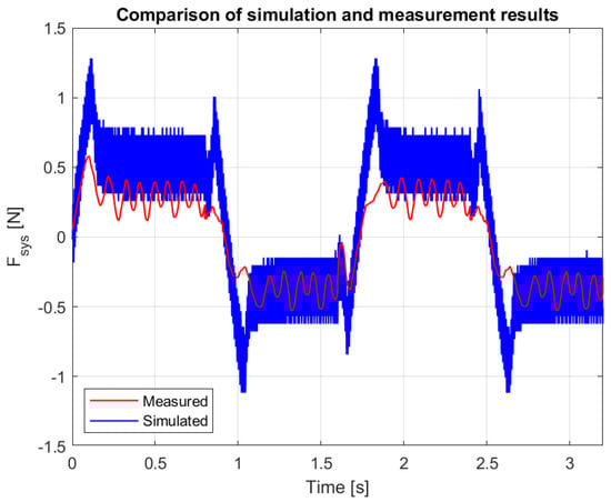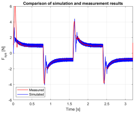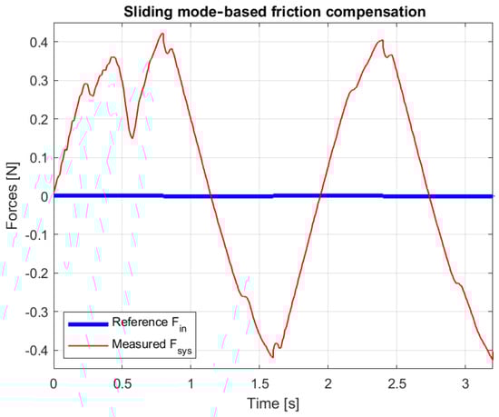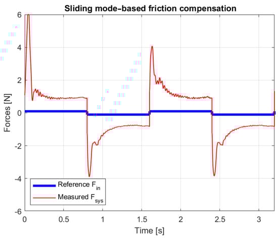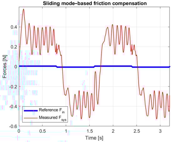 In our experimental setup, due to the special force compensation, the “artificial friction force” is only  N at a constant speed of  m/s. We assume that the operator applies force pulses of alternating sign to the master device along the x axis. The magnitudes of the force pulses are  N and  N, respectively. To ensure smooth motion of the master device, the compensation force was generated by a compensation toolset (model reference adaptive control loop) instead of the operator. In the steady state of the master device, this force results in a velocity of  m/s and  m/s in the case of the reference model (see Section 6).