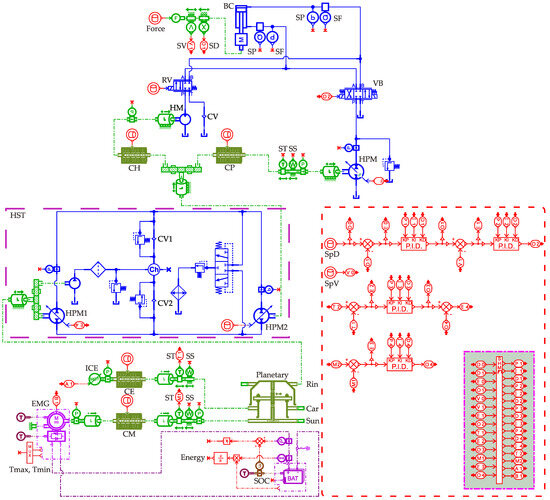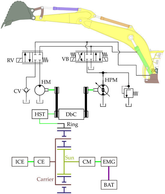 To improve energy-saving efficiency, this study introduces a novel system specifically designed for the boom mechanism. As depicted in Figure 1, the new design aims to reduce the ICE energy consumption during boom extension while also enabling dual energy regeneration during boom retraction. The HST and HPM serve as the two pivotal components in the proposed system. The output shaft of the planetary gear is precisely managed by both the HST and HPM, allowing for versatile integration with either the HPM or the hydraulic motor (HM). This innovative system introduces control mechanisms that have not been explored in previous designs. The refined control strategy supports smooth transitions between two operational modes, ‘boom-up’ and ‘boom-down’, regardless of how the HST is connected to the HPM. This paper presents an advanced electrical hydraulic continuously variable powertrain as shown in Figure 1. In practical engineering scenarios, the proposed system enhances fuel economy across various speeds by effectively adjusting to different operational conditions.