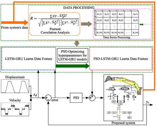 In order to improve tracking accuracy and energy efficiency in the proposed system, coordinated management of the components is implemented using the PSO-LSTM-GRU-PID controller. Specifically, valve control improves the cylinder’s positioning accuracy by modifying the opening size of the control valve. At the same time, the HST is responsible for regulating the system’s energy consumption. The structure of the PSO-LSTM-GRU-PID algorithm is illustrated in Figure 2, and its operation is explained in detail in the following section. In the diagram, represents the desired value (reference input), such as the target position or velocity for the system to achieve. is the actual output, the measured value from the system, used as feedback to compare against and adjust the control to minimize error.